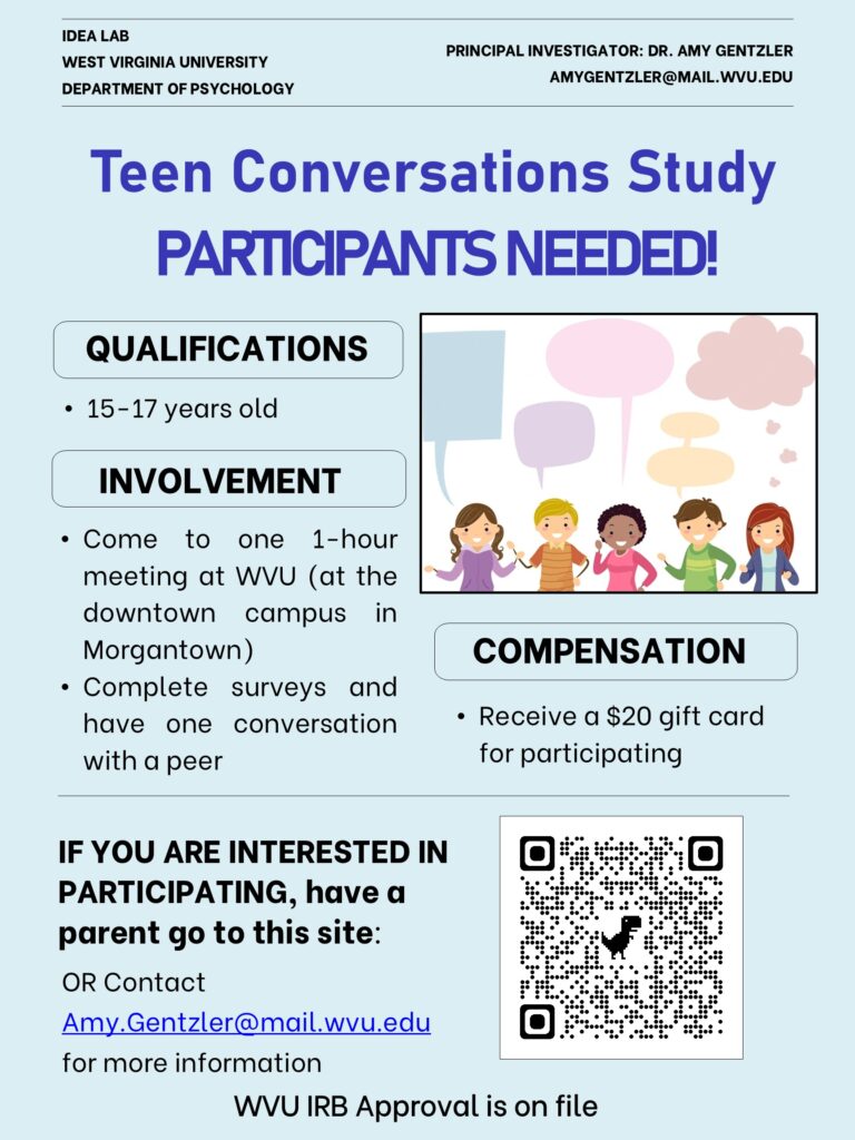 We are currently recruiting 15-17 year old teens for a study that involves one visit to WVU. Parents, scan the QR code below to give permission to your teen to participate: